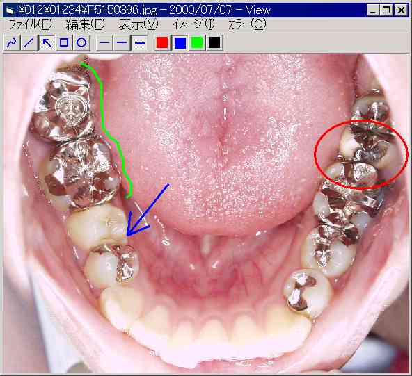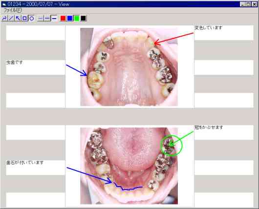 サムネイルをダブルクリックすると表示される画面です。 この画面では線や丸を書いて患者さんにわかりやすく説明できます。